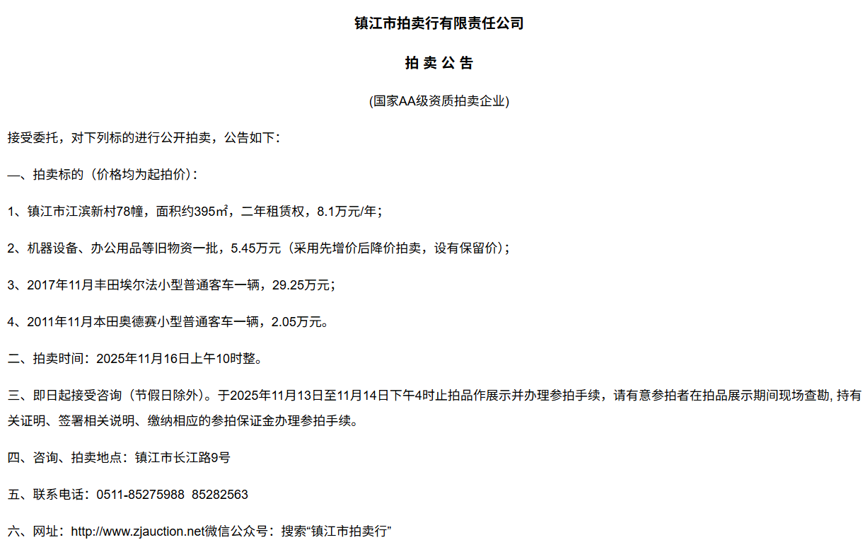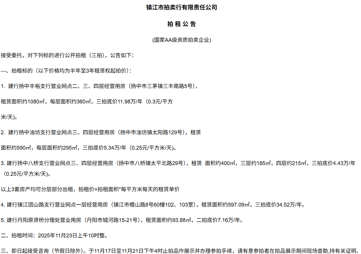 鎮江市拍賣行有限責任公司拍 租 公 吿(國家AA級資質拍賣企業)接受委托,對下列標的進行公開拍租(三拍),公告如下:—、拍租標的(以下價格均為半年至3年租賃權起拍價):1.  建行揚中豐裕支行營業網點二、三、四層經營用房(揚中市三茅鎮三豐南路5號),租賃面積約1080㎡,每層面積約360㎡,三拍底價11.98萬/年(0.3元/平方米/天)。2.  建行揚中油坊支行營業網點三、四層經營用房(揚中市油坊鎮太陽路129號),租賃面積約590㎡,每層面積約295㎡,三拍底價5.34萬/年(0.25元/平方米/天)。3. 建行揚中八橋支行營業網點三、四層經營用房(揚中市八橋鎮太平北路29號),租賃  面積約400㎡,三層約185㎡,四層約215㎡,三拍底價4.43萬/年(0.25元/平方米/天)。以上3套房產均可分層部分出租,拍租價=拍租面積*每平方米每天的租賃單價4. 建行鎮江團山路支行營業網點一層經營用房(鎮江市檀山路8號60幢102、103室),租賃面積約597.09㎡,三拍底價34.52萬/年。5. 建行丹陽原賢橋分理處營業用房(丹陽市城河路15-21號),租賃面積約93.88㎡,二拍底價7.16萬/年。二、拍租時間:2025年11月23日上午10時整。三、即日起接受咨詢(節假日除外)。于11月17日至11月21日下午4時止拍品作展示并辦理參拍手續,請有意參拍者在拍品展示期間現場查勘,持有關證明、簽署相關說明、繳納相應的參拍保證金辦理參拍手續。四、咨詢、拍租地點:鎮江市長江路9號五、聯系方式:0511-85275988   13655299933楊先生六、網址:http://www_zjauction_net.87077770.cn;微信公眾號:搜索“鎮江市拍賣行” 拍品清單2025.11.23序號名稱起拍價(元)標的說明1建行揚中豐裕支行營業網點二、三、四層經營用房(揚中市三茅鎮三豐南路5號),租賃面積約1080㎡,每層面積約360㎡三拍底價11.98萬/年(0.3元/平方米/天)1、1-3號房產均可分層部分出租,拍租價=拍租面積*每平方米每天的租賃單價;2、意向競拍人在拍賣前需持營業執照或身份證與委托方說明租賃房產經營業態,確定意向后出具房產承租用途承諾書,經委托方審核后,方可交納保證金參加競拍;3、租賃期限為半年至3年(承租方與出租方協商而定),承租方每半年或一年結付租金,租賃期間的水、電費用及其它相關費用均由承租方承擔;4、承租方不得用于經營和保管危險物品,不得用于開設餐飲、娛樂等可能嚴重影響消防安全、運營安全的經營業態,不得用于經營委托貸款、小額貸款等可能冒用委托方名義,帶來聲譽風險的經營業態。租賃期內,承租方不得破壞墻體結構,自行成就消防、安全等使用條件,不得擅自將租賃房屋轉租、轉讓給他人使用,否則委托方有權收回房屋;5、拍租成交后,承租方將租金交至出租方指定賬戶,傭金交至拍賣方賬戶(拍租傭金為該房屋一個月租金)。承租方憑租賃合同無息退還保證金。2建行揚中油坊支行營業網點三、四層經營用房(揚中市油坊鎮太陽路129號),租賃面積約590㎡,每層面積約295㎡三拍底價5.34萬/年(0.25元/平方米/天)3建行揚中八橋支行營業網點三、四層經營用房(揚中市八橋鎮太平北路29號),租賃面積約490㎡,每層面積約245㎡三拍底價4.43萬/年(0.25元/平方米/天)4建行鎮江團山路支行營業網點一層經營用房(鎮江市檀山路8號60幢102、103室),建筑面積約597.09㎡三拍底價34.52萬/年5建行丹陽原賢橋分理處營業用房(丹陽市城河路15-21號),建筑面積約93.88㎡二拍底價7.16萬/年